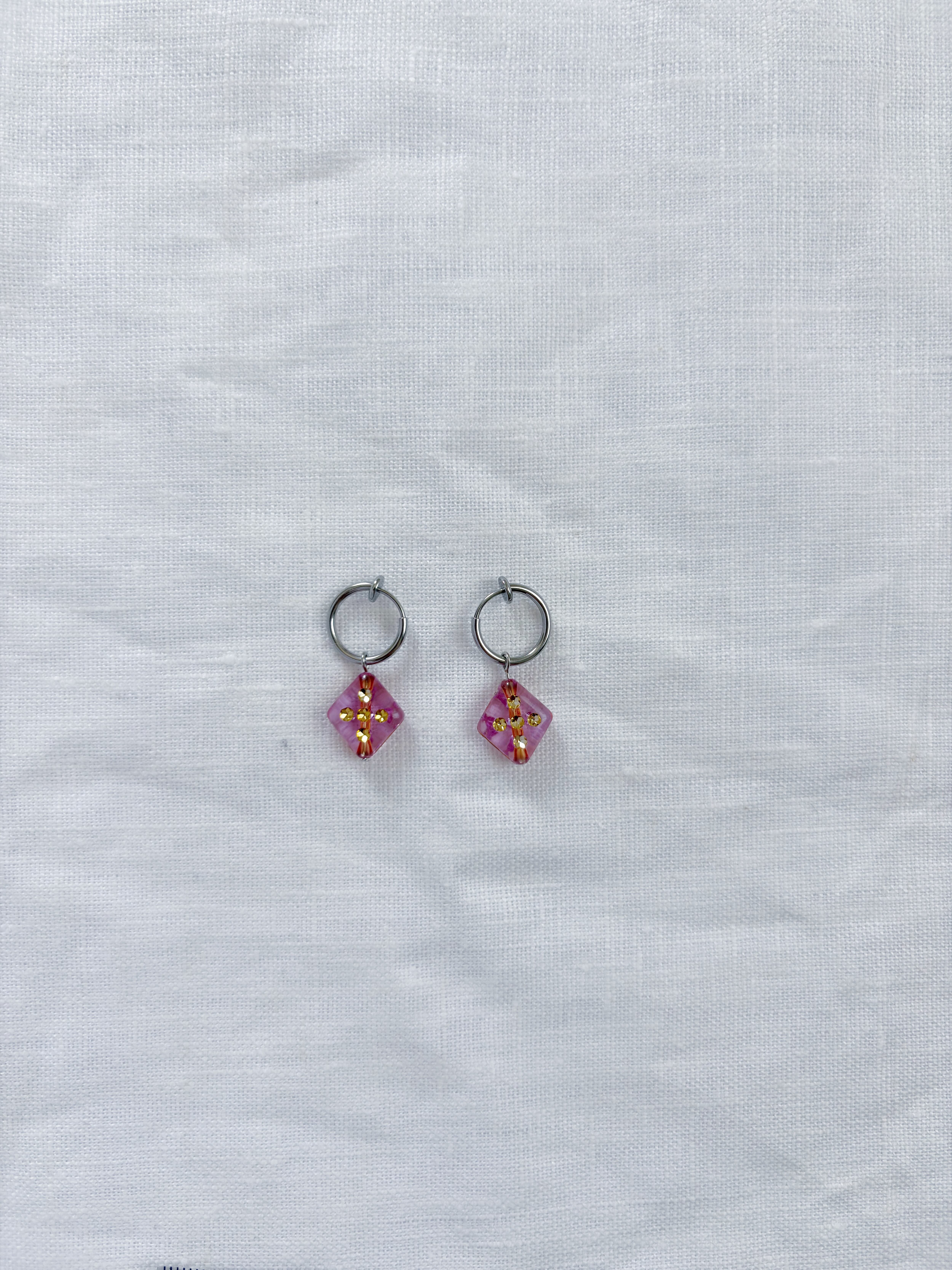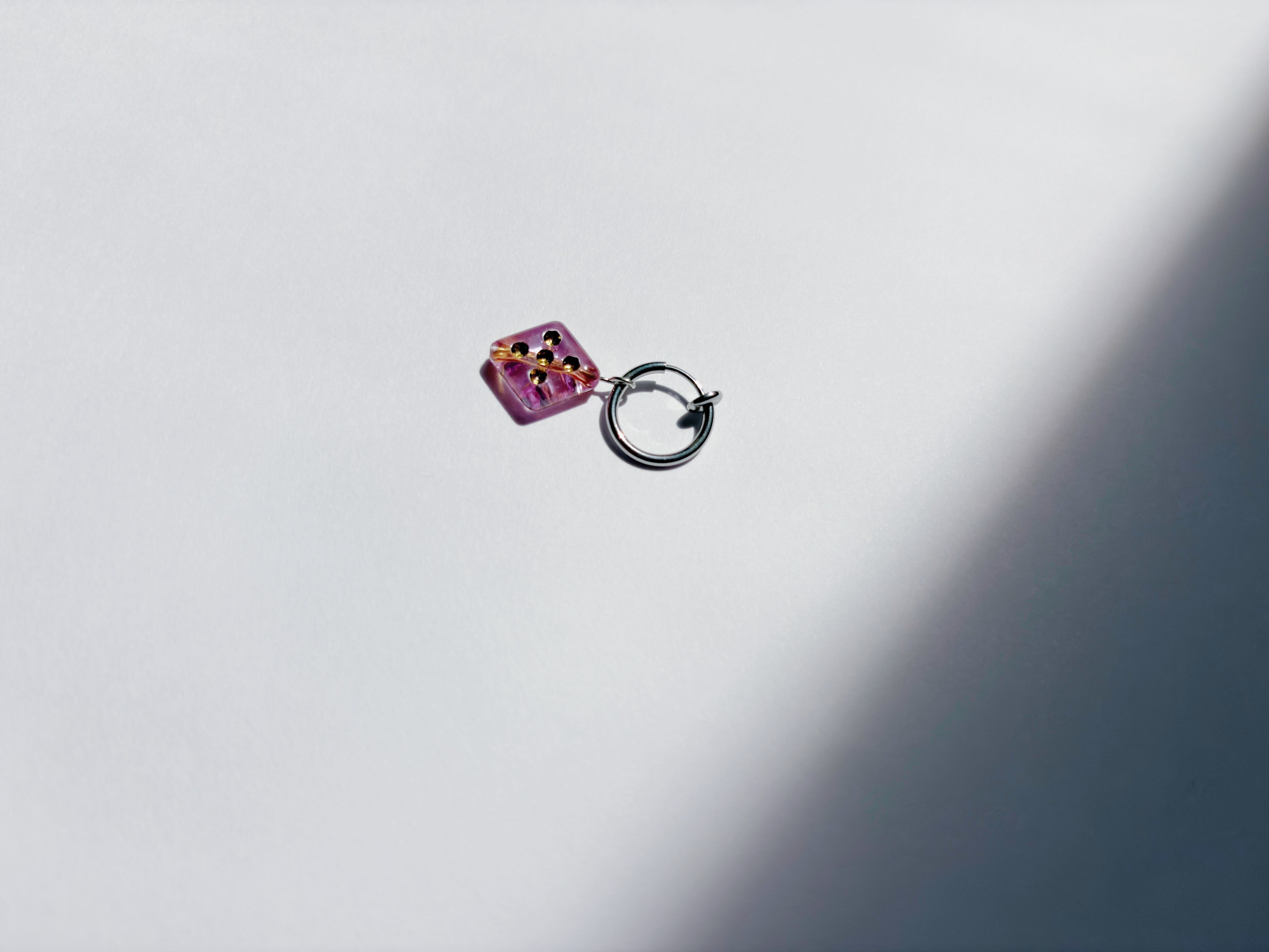 クリアなピンクに、まるでサイコロの目のようなゴールドの模様という珍しい柄。