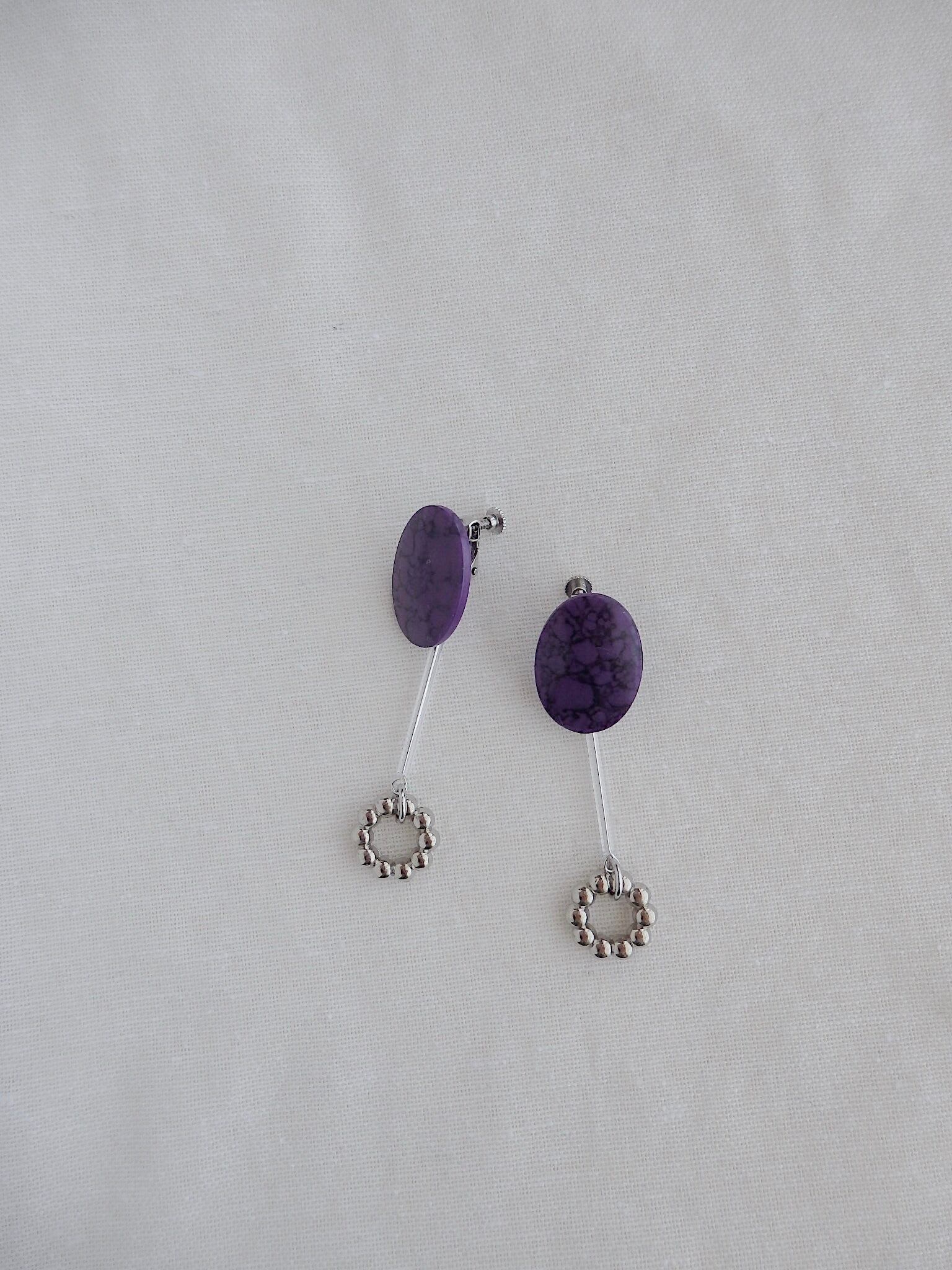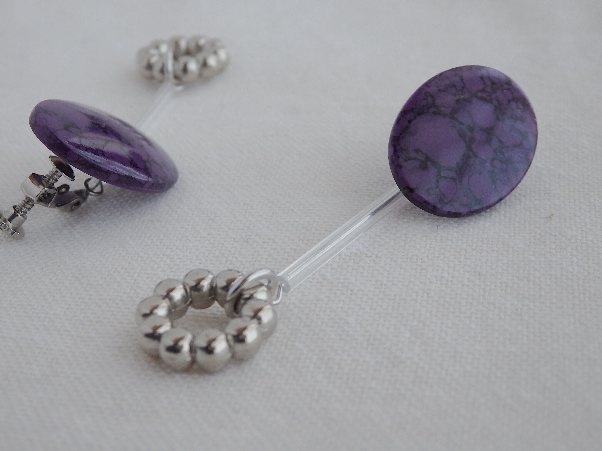 存在感のある紫色のカボションと、ドーナツのようなぽこぽこリングが印象的なイヤリングです( ピアスでお作りもできます )