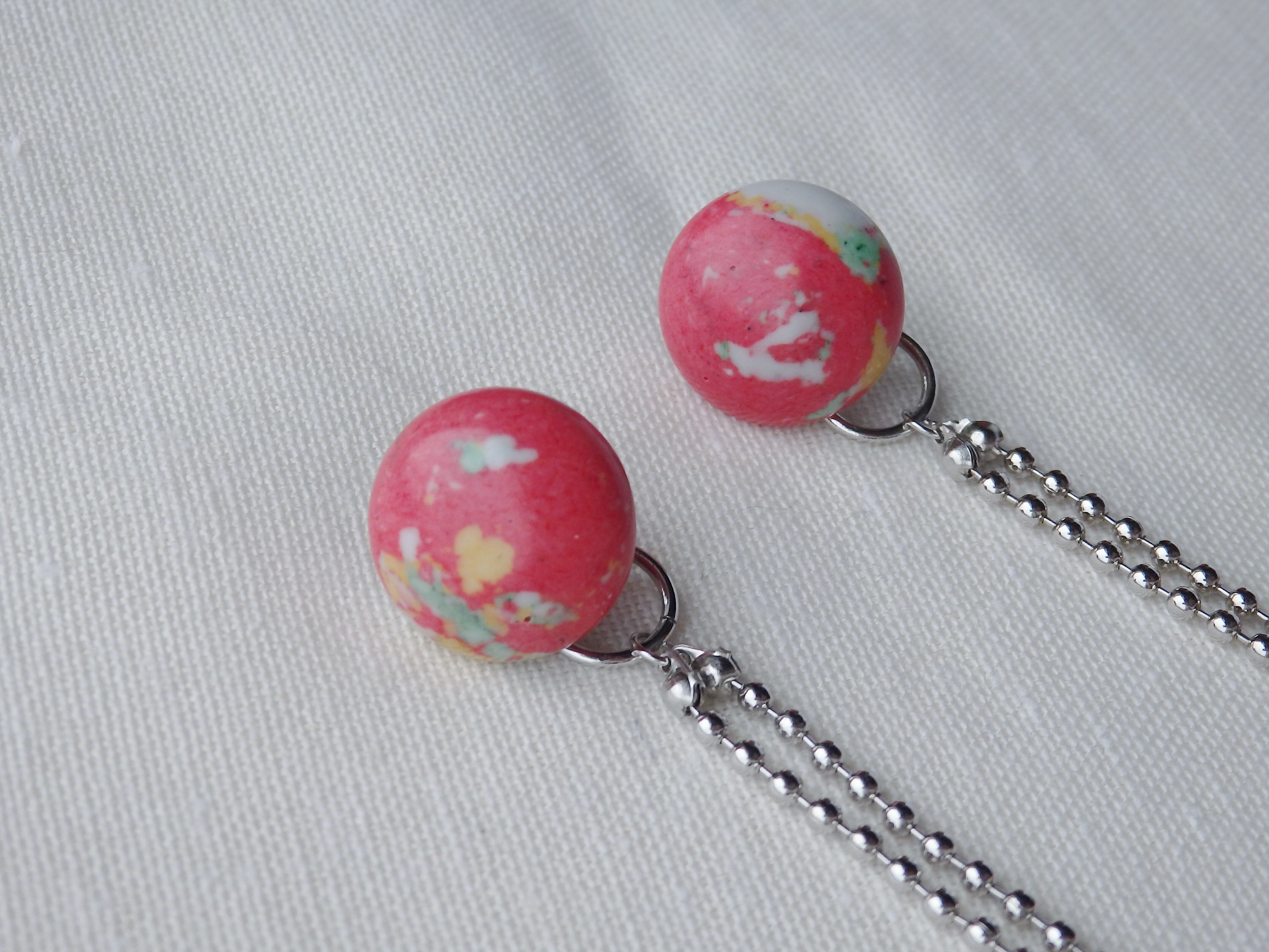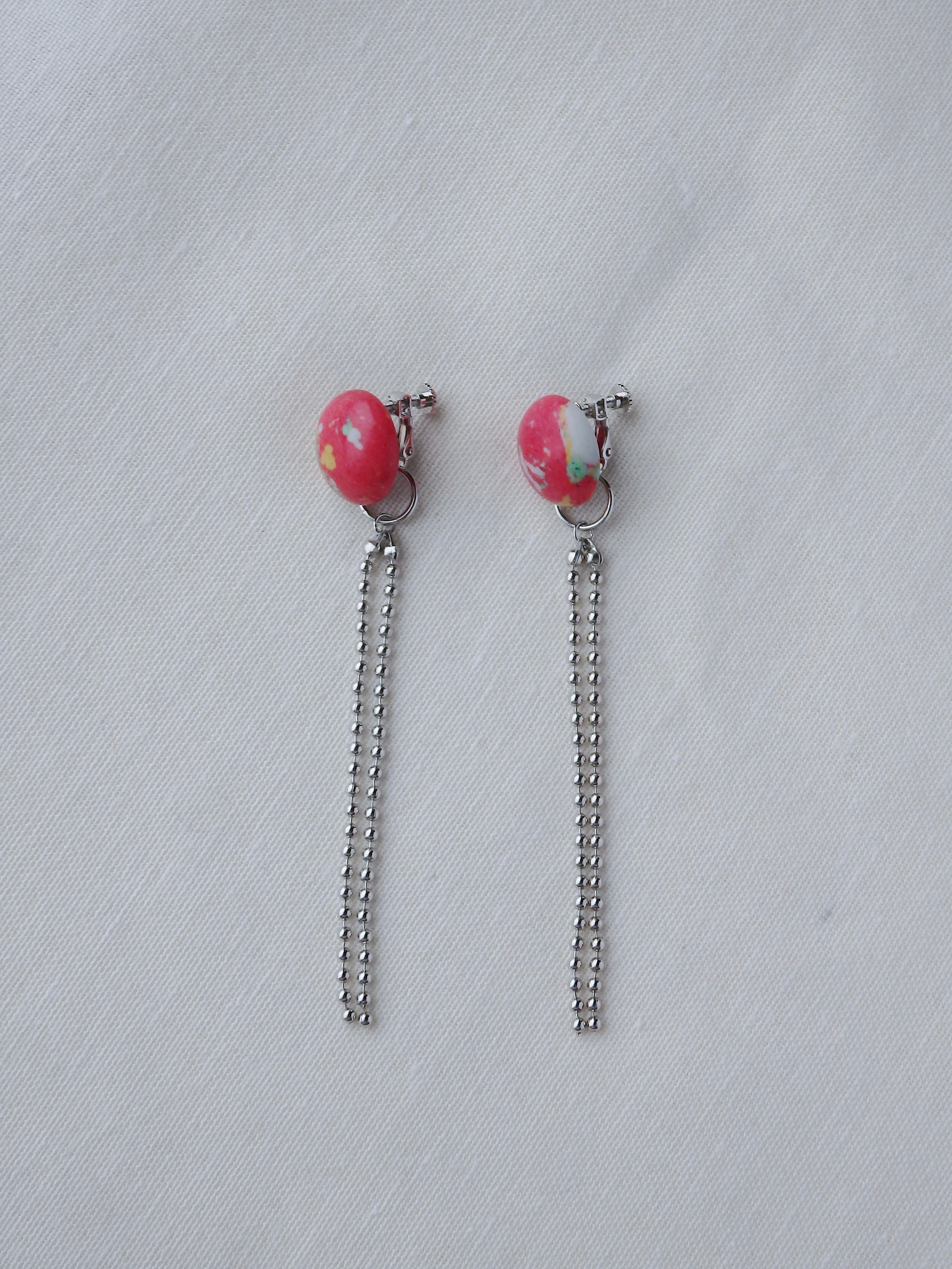 赤ベースに、緑や黄色がマーブルに入った個性的なvintageパーツが印象的なイヤリングです。