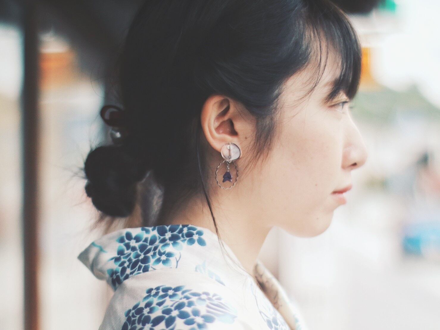 もくもくシルバーフープの中に入った小さな三角パーツと、逆耳の偏光チューブビーズに通された3つの薄いグレーのクリアフープがチラチラと揺れて、