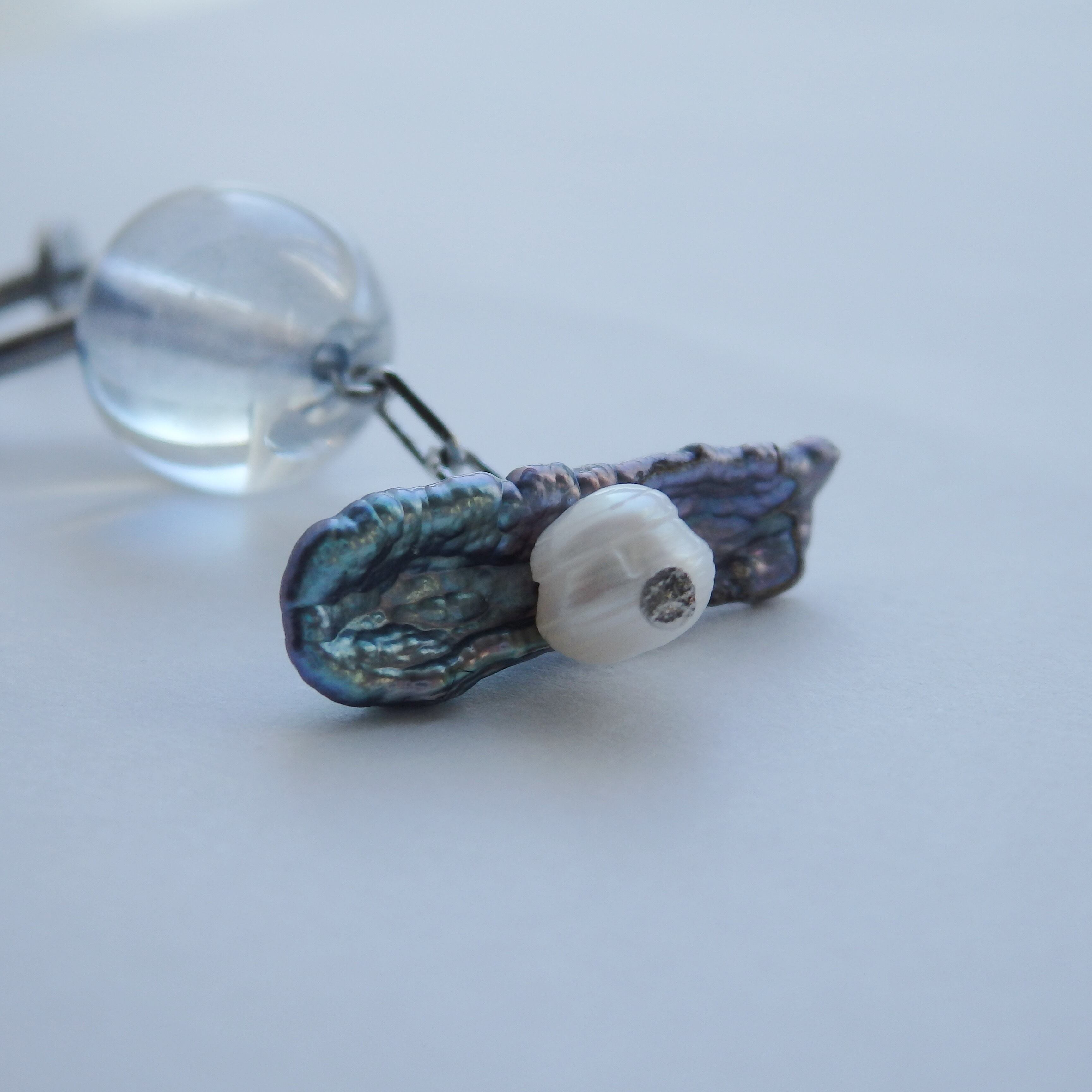 また横一文字に配置している濃い青のパーツは、淡水パールを使用していて、