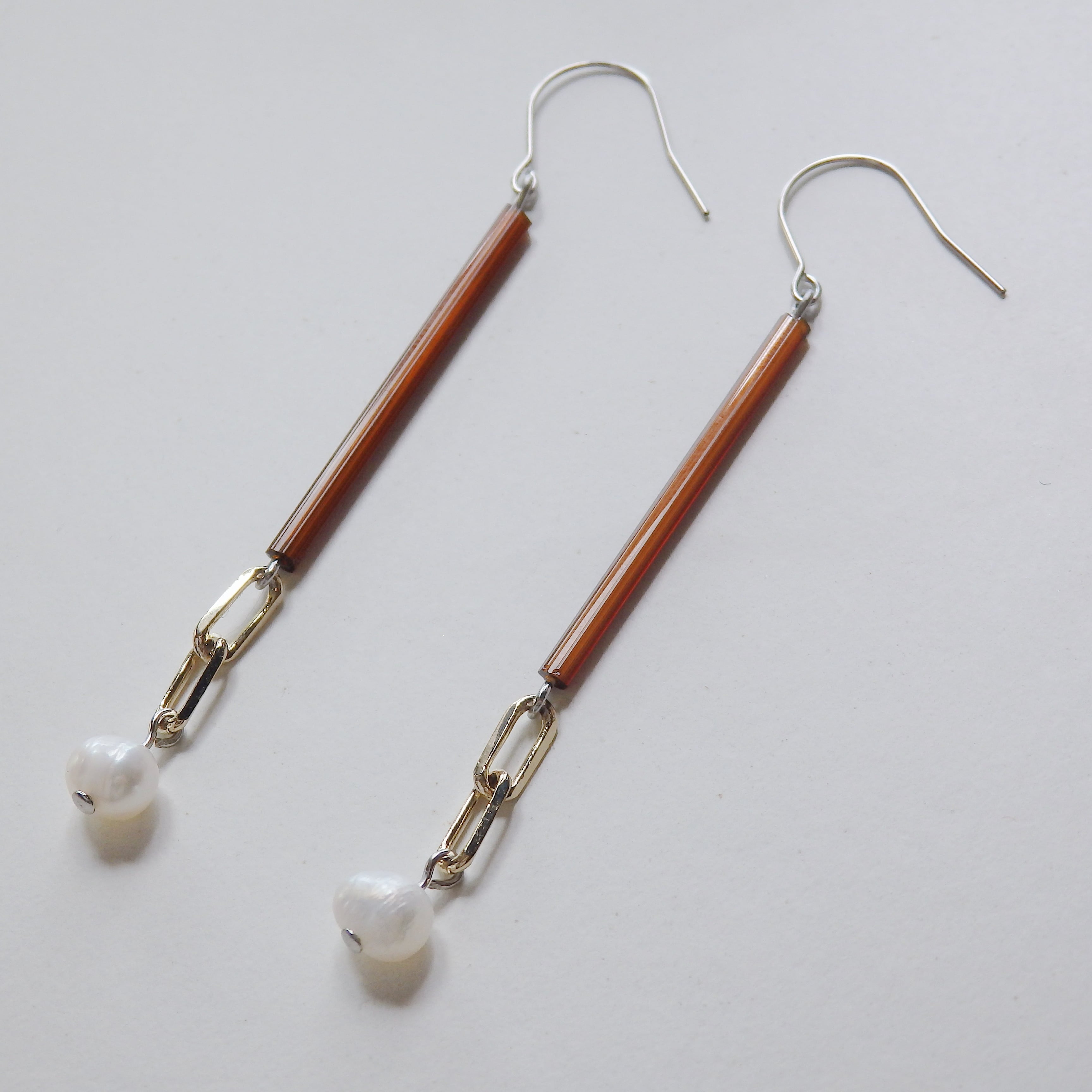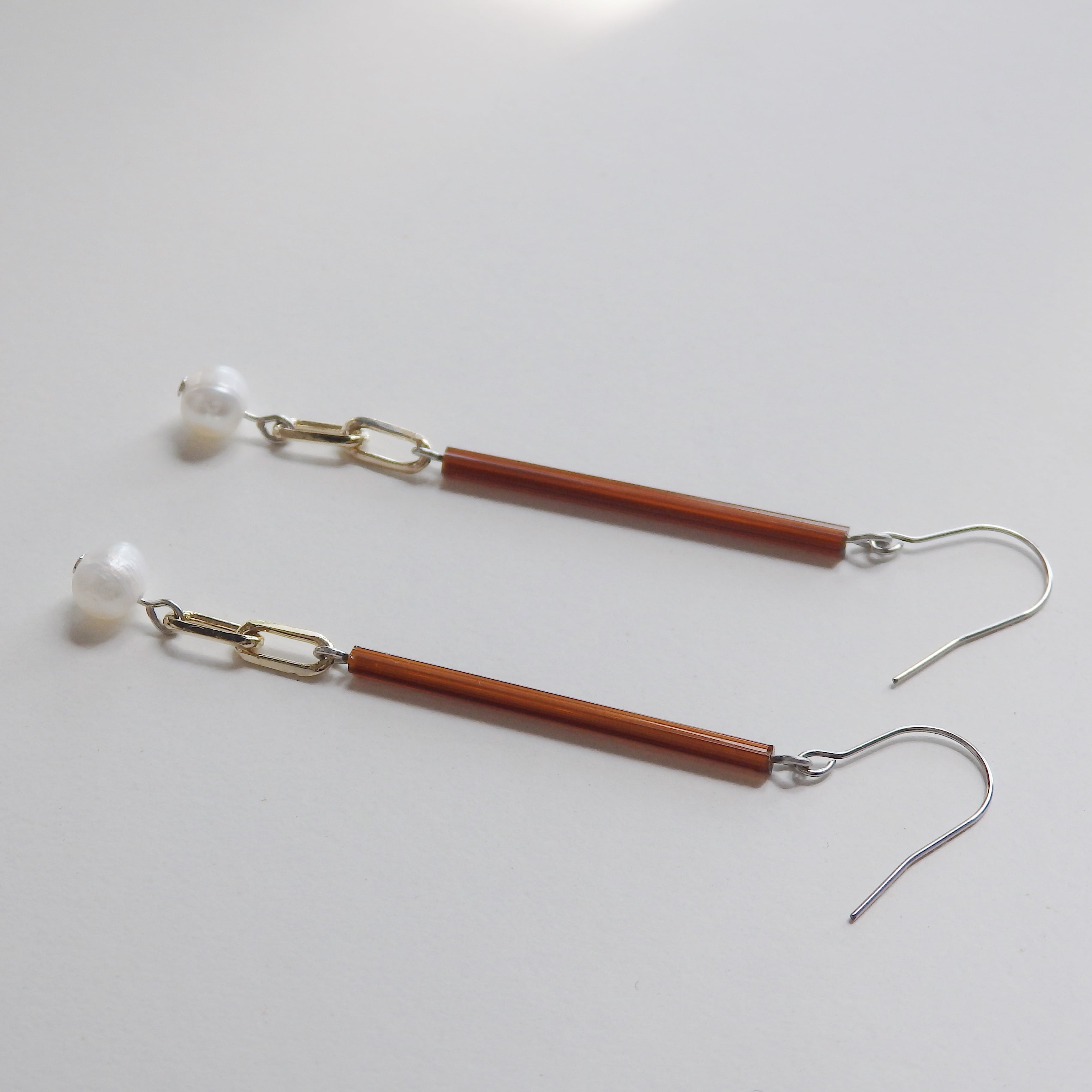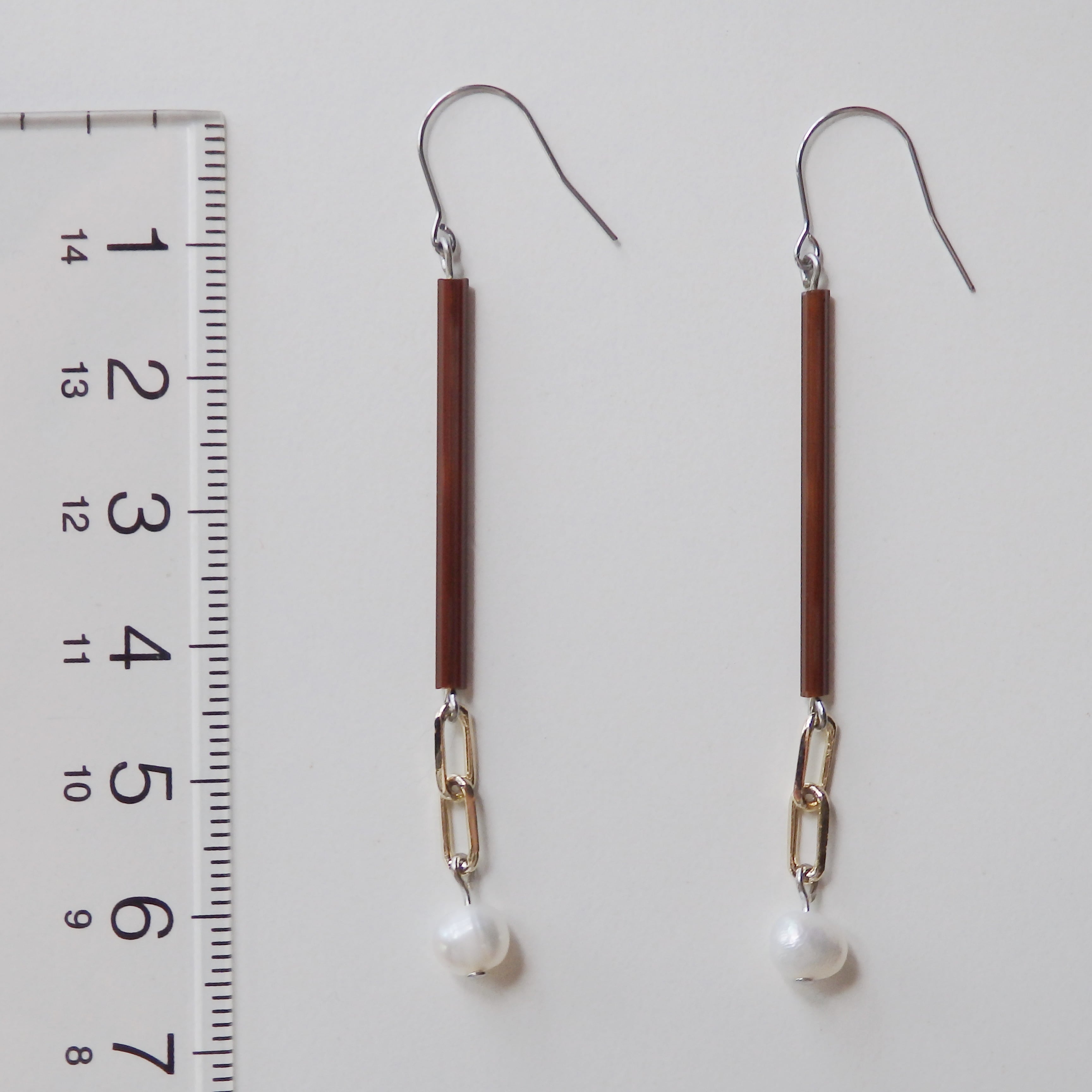 チューブビーズと淡水パールを繋ぐチェーンがしゃらしゃらと軽やかに耳元で揺れる、大人っぽい飾りです。
